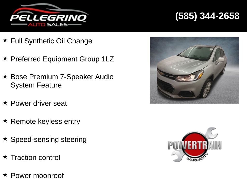 Recent Arrival! 2018 Chevrolet Trax Premier Silver Ice Metallic Premier ECOTEC 1.4L I4 SMPI DOHC Turbocharged VVT 6-Speed Automatic AWD Full Synthetic Oil Change, 6-Way Power Driver Seat Adjuster, All-Wheel Drive Chassis, Bose Premium 7-Speaker Audio System Feature, Brake assist, Electronic Stability Control, Exterior Parking Camera Rear, Front Bucket Seats, Heated door mirrors, Heated Driver & Front Passenger Seats, Heated front seats, Leatherette Seat Trim, Panic alarm, Power driver seat, Power moonroof, Preferred Equipment Group 1LZ, Remote keyless entry, Security system, Speed-sensing steering, Traction control.