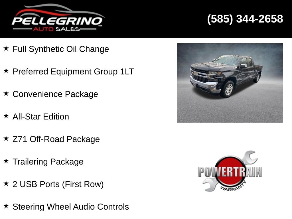 Recent Arrival! 2019 Chevrolet Silverado 1500 LT Black LT EcoTec3 5.3L V8 8-Speed Automatic 4WD Full Synthetic Oil Change, 2 USB Ports (First Row), 4-Way Manual Driver Seat Adjuster, 4.2" Diagonal Color Display Driver Info Center, All-Star Edition, Bluetooth® For Phone, Brake assist, Chrome Grille, Chrome Mirror Caps, Color-Keyed Carpeting Floor Covering, Compass, Convenience Package, Deep-Tinted Glass, Dual Exhaust w/Polished Outlets, Electronic Cruise Control, Electronic Stability Control, Front Frame-Mounted Black Recovery Hooks, Front Rubberized Vinyl Floor Mats, Heavy-Duty Rear Locking Differential, High Capacity Air Filter, Hill Descent Control, Locking Tailgate, Manual Tilt Wheel Steering Column, Off-Road Suspension, OnStar & Chevrolet Connected Services Capable, Power Door Locks, Power Front Windows w/Driver Express Up/Down, Power Front Windows w/Passenger Express Down, Power Rear Windows w/Express Down, Preferred Equipment Group 1LT, Rear 60/40 Folding Bench Seat (Folds Up), Rear Rubberized-Vinyl Floor Mats, Rear Vision Camera, Remote Keyless Entry, Remote Vehicle Starter System, Single-Zone Manual/Semi-Automatic Air Conditioning, Steering Wheel Audio Controls, Theft Deterrent System (Unauthorized Entry), Trailering Package, Urethane Steering Wheel, Z71 Off-Road Package.