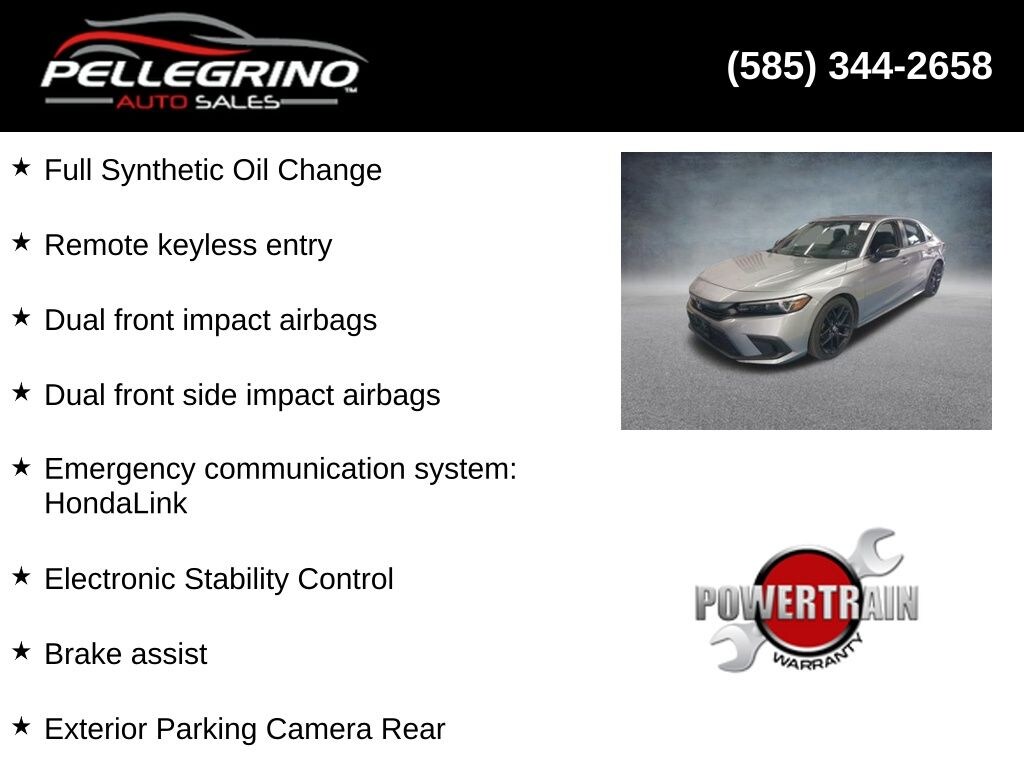 Recent Arrival! 2022 Honda Civic Sport Sport 2.0L I4 DOHC 16V i-VTEC CVT FWD Full Synthetic Oil Change, Alloy wheels, Brake assist, Dual front impact airbags, Dual front side impact airbags, Electronic Stability Control, Emergency communication system: HondaLink, Exterior Parking Camera Rear, Front Bucket Seats, Panic alarm, Remote keyless entry, Security system.