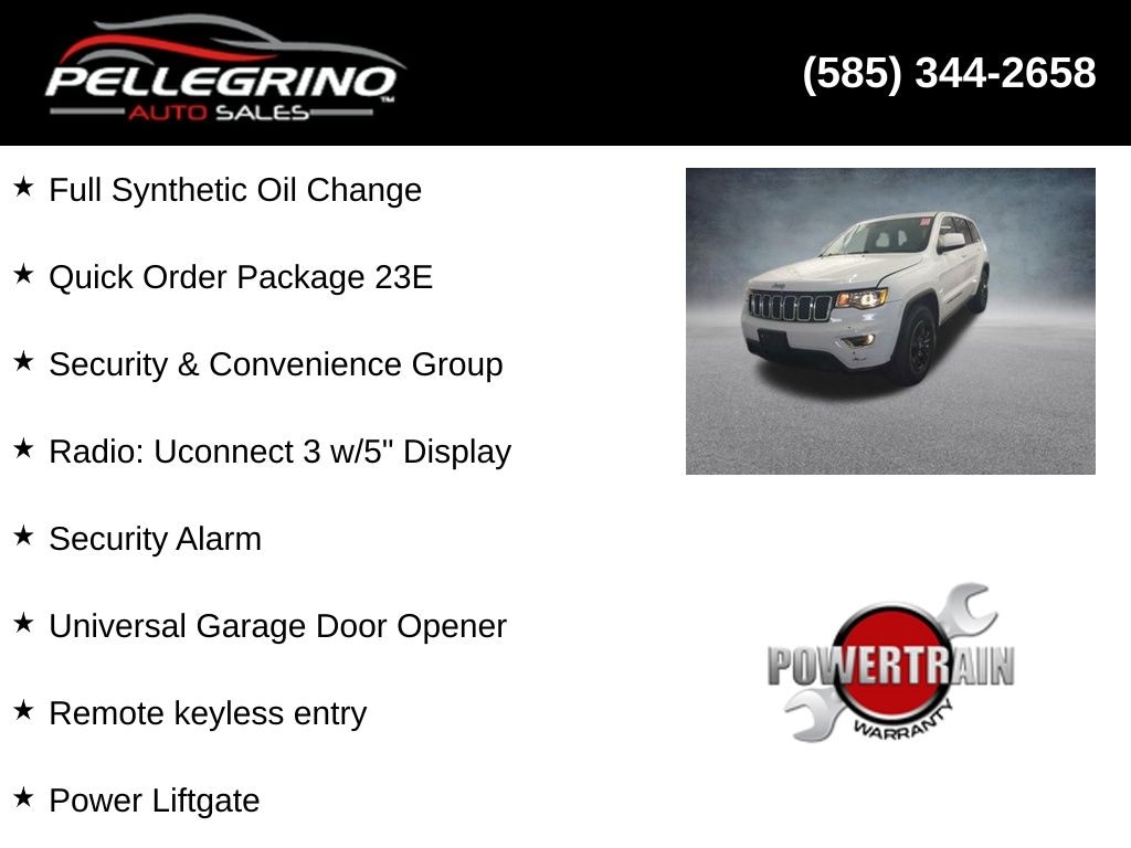 Recent Arrival! 2017 Jeep Grand Cherokee Laredo Bright White Clearcoat Laredo 3.6L V6 24V VVT 8-Speed Automatic 4WD Full Synthetic Oil Change, 115V Auxiliary Power Outlet, Alloy wheels, Brake assist, Bright Side Roof Rails, Electronic Stability Control, Power 4-Way Driver Lumbar Adjust, Power 8-Way Driver/Manual Passenger Seat, Power Liftgate, Quick Order Package 23E, Radio: Uconnect 3 w/5" Display, Remote keyless entry, Security & Convenience Group, Security Alarm, Universal Garage Door Opener.