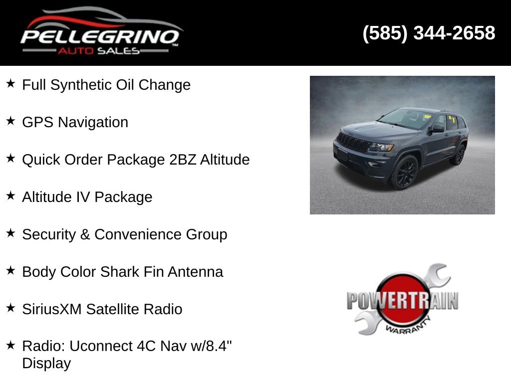 Recent Arrival! 2018 Jeep Grand Cherokee Altitude Rhino Clearcoat Altitude 3.6L V6 24V VVT 8-Speed Automatic 4WD Full Synthetic Oil Change, 1-Year SiriusXM Radio Service, Alloy wheels, Altitude Grille, Altitude IV Package, Apple CarPlay, Auto-Dimming Rear-View Mirror, Black Suede Seats w/Black Stitching, Body Color Claddings, Body Color Fascia, Body Color Shark Fin Antenna, Brake assist, Dark Day Light Opening Moldings, Dark Headlamp Bezel Finish, Dark Lens Taillamps, Delete Laredo Badge, Electronic Stability Control, Front Accent/Body Color Fascia, Gloss Black Rear Fascia Applique, GPS Navigation, Jeep Black Gloss Badging, ParkView Rear Back-Up Camera, Power 4-Way Driver Lumbar Adjust, Power 8-Way Driver/Manual Passenger Seat, Power Liftgate, Power Sunroof, Quick Order Package 2BZ Altitude, Radio: Uconnect 4C Nav w/8.4" Display, Rear Accent/Body Color Fascia, Rear Fascia Black MIC Step Pad, Remote keyless entry, Security & Convenience Group, Single Exhaust w/Bright Tip, SiriusXM Satellite Radio, Steering Wheel Mounted Audio Controls, Wheels: 20" x 8.0" Gloss Black Aluminum.