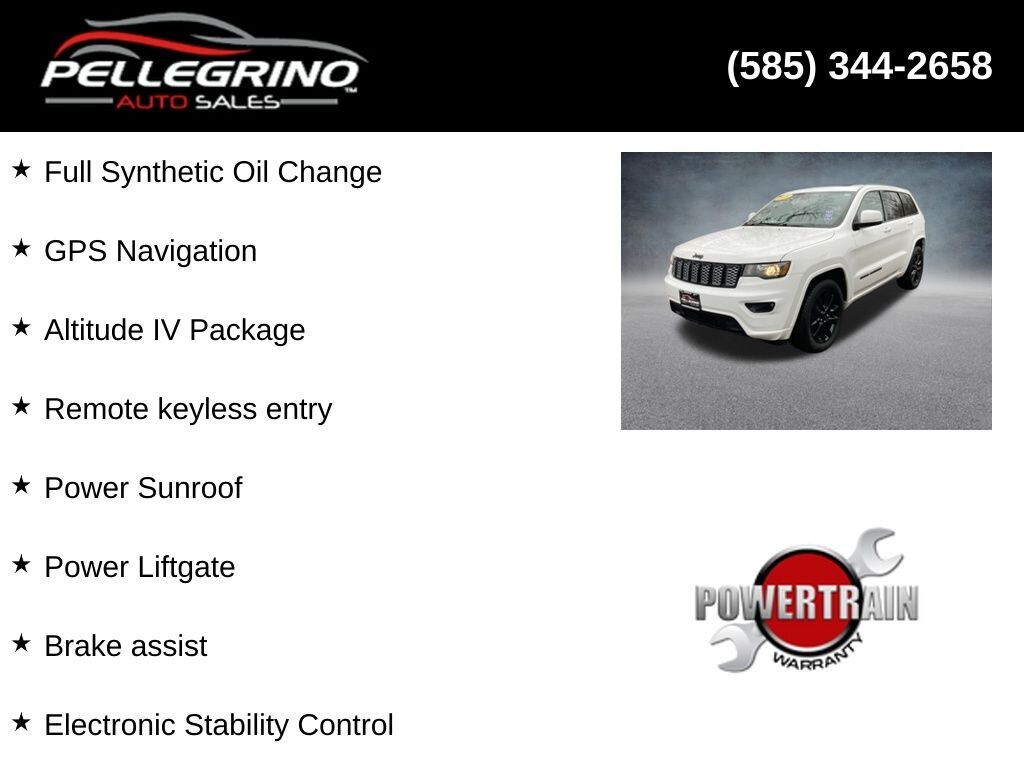 Recent Arrival! 2019 Jeep Grand Cherokee Altitude Bright White Clearcoat Altitude 3.6L V6 24V VVT 8-Speed Automatic 4WD Full Synthetic Oil Change, Alloy wheels, Altitude IV Package, Brake assist, Electronic Stability Control, GPS Navigation, ParkView Rear Back-Up Camera, Power 8-Way Driver/Manual Passenger Seat, Power Liftgate, Power Sunroof, Remote keyless entry.