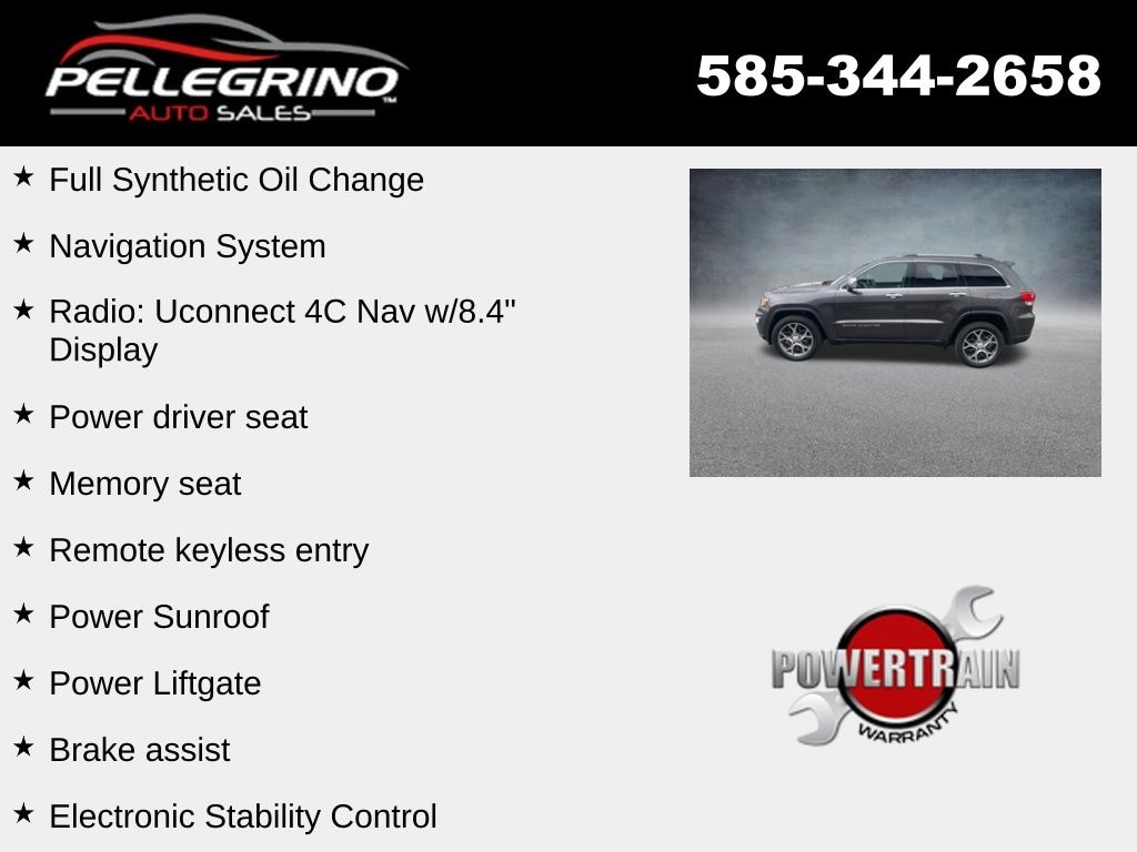 2019 Jeep Grand Cherokee Limited Granite Crystal Metallic Clearcoat Limited 3.6L V6 24V VVT 8-Speed Automatic 4WD Full Synthetic Oil Change, 8.4" Touchscreen Display, Alloy wheels, Apple CarPlay/Android Auto, Brake assist, Electronic Stability Control, Front Bucket Seats, Heated front seats, Memory seat, Navigation System, ParkView Rear Back-Up Camera, Power driver seat, Power Liftgate, Power Sunroof, Radio: Uconnect 4C Nav w/8.4" Display, Remote keyless entry.