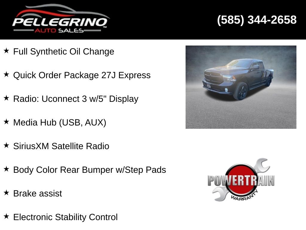 Recent Arrival! 2018 Ram 1500 Express Brilliant Black Crystal Pearlcoat Express HEMI 5.7L V8 Multi Displacement VVT 8-Speed Automatic 4WD Full Synthetic Oil Change, 17" x 7" Aluminum Wheels, 5.0" Touchscreen Display, Body Color Front Fascia, Body Color Grille, Body Color Rear Bumper w/Step Pads, Brake assist, Carpet Floor Covering, Center Hub, Charge Only Remote USB Port, Delete Class IV Receiver Hitch, Delete Spray In Bedliner, Dual Rear Exhaust w/Bright Tips, Electronic Stability Control, Front Floor Mats, Front Fog Lamps, GPS Antenna Input, Integrated Voice Command w/Bluetooth, Media Hub (USB, AUX), Overhead Console, ParkView Rear Back-Up Camera, Quick Order Package 27J Express, Radio: Uconnect 3 w/5" Display, Ram 1500 Express, Rear Floor Mats, Rear View Day/Night Mirror, SiriusXM Satellite Radio, Temperature & Compass Gauge.