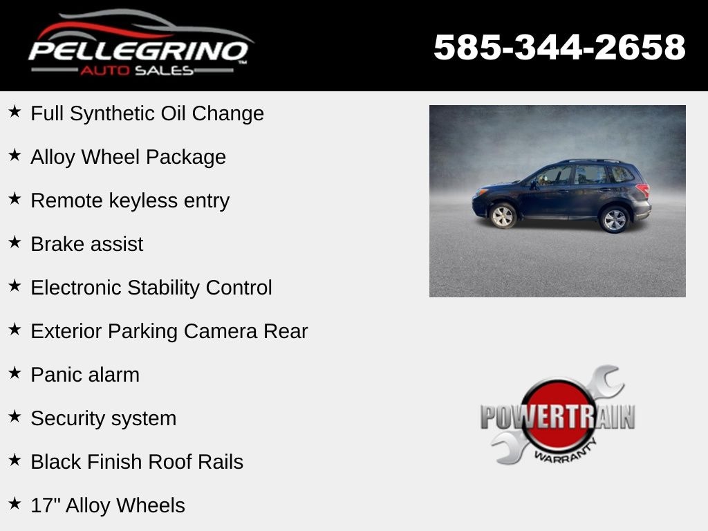 2015 Subaru Forester 2.5i Dark Gray Metallic 2.5i 2.5L 4-Cylinder DOHC 16V VVT Lineartronic CVT AWD Full Synthetic Oil Change, 17" Alloy Wheels, Alloy Wheel Package, Black Finish Roof Rails, Brake assist, Electronic Stability Control, Exterior Parking Camera Rear, Panic alarm, Remote keyless entry, Security system.