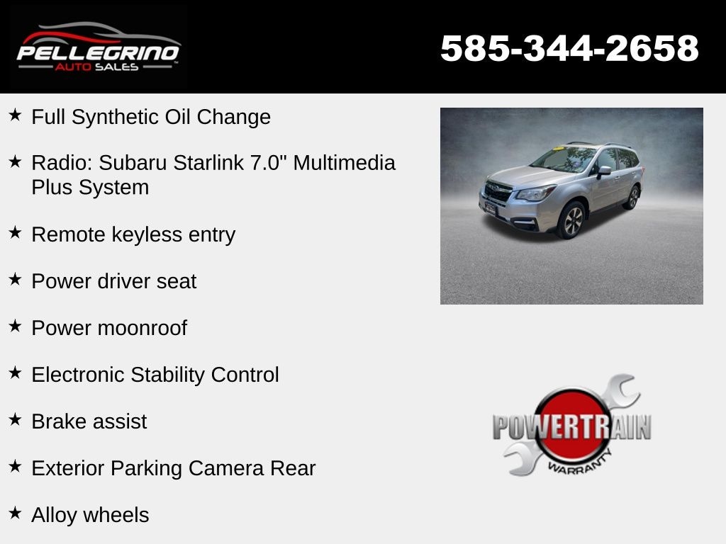 2018 Subaru Forester 2.5i Premium Ice Silver Metallic 2.5i Premium 2.5L 4-Cylinder DOHC 16V VVT Lineartronic CVT AWD Full Synthetic Oil Change, Alloy wheels, Brake assist, Electronic Stability Control, Exterior Parking Camera Rear, Power driver seat, Power moonroof, Radio: Subaru Starlink 7.0" Multimedia Plus System, Remote keyless entry.