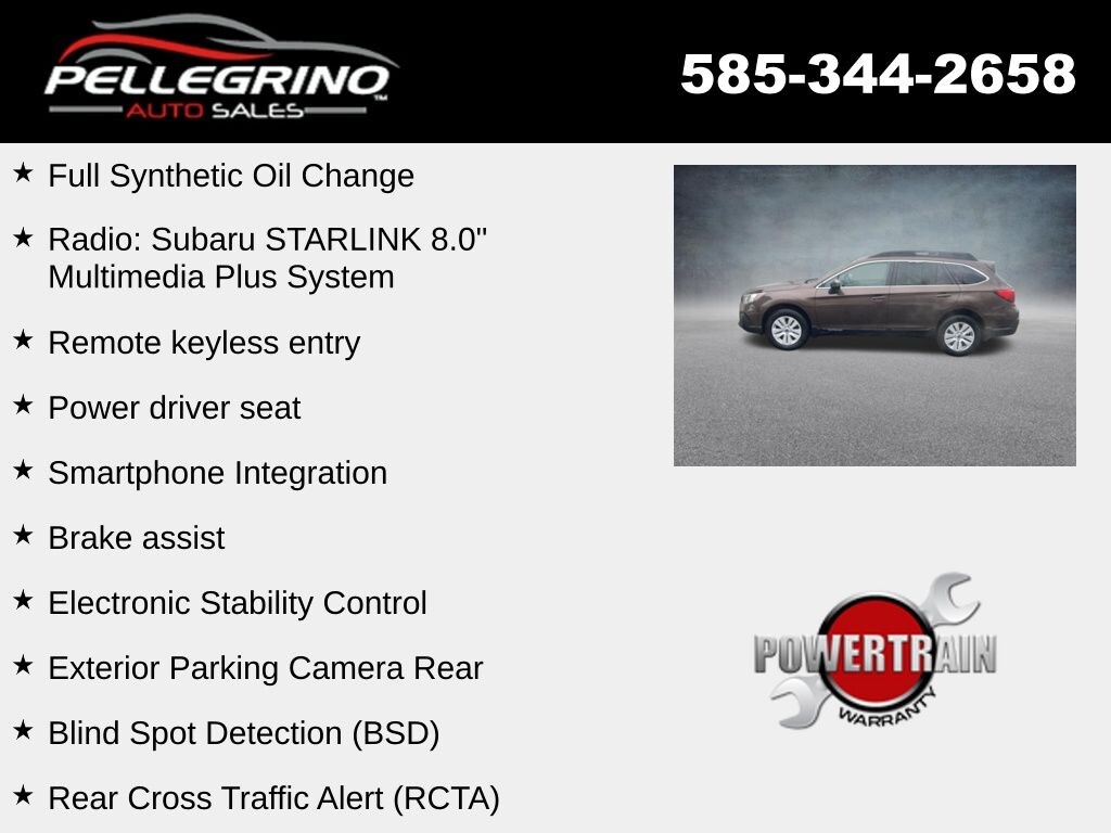 2019 Subaru Outback 2.5i Premium Cinnamon Brown Pearl 2.5i Premium 2.5L 4-Cylinder DOHC 16V CVT Lineartronic AWD Full Synthetic Oil Change, Alloy wheels, Blind Spot Detection (BSD), Brake assist, Electronic Stability Control, Exterior Parking Camera Rear, Heated Front Bucket Seats, Power driver seat, Radio: Subaru STARLINK 8.0" Multimedia Plus System, Rear Cross Traffic Alert (RCTA), Remote keyless entry, Smartphone Integration, STARLINK/Apple CarPlay/Android Auto, Vehicle Information Display.